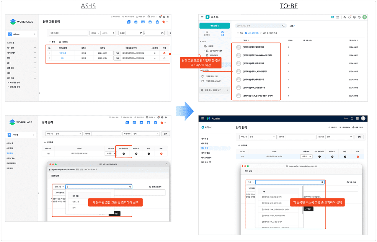 - 기존 WORKPLACE에서 운영되고 있던 권한 그룹은 통합일에 맞추어 모두 네이버웍스 그룹으로 이관됩니다.