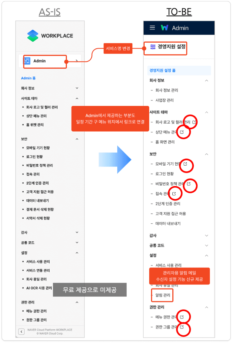 기존 WORKPLACE의 Admin은 경영지원 설정으로 명칭이 변경되며, 세부 기능은 아래와 같이 변경됩니다.