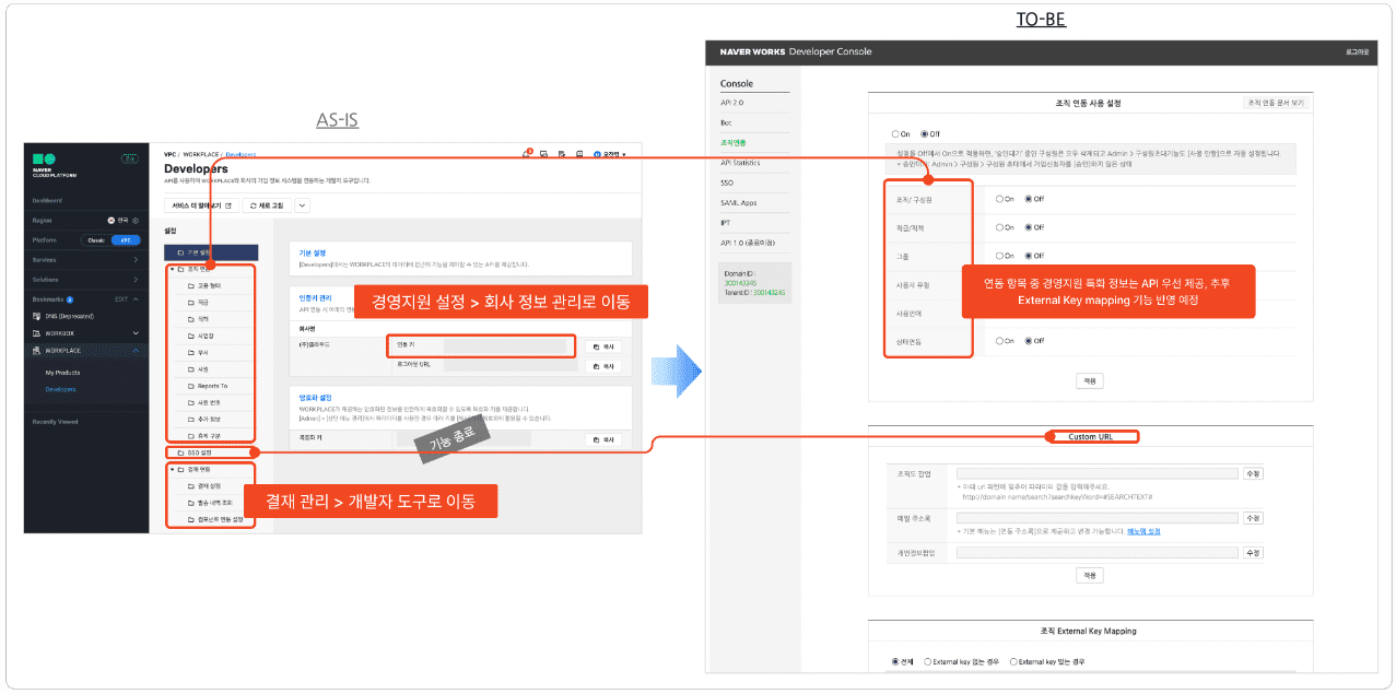 새롭게 연동하거나 기존 연동 방식을 변경할 경우, 네이버웍스 Developers에서 업무를 진행하시기 바랍니다.