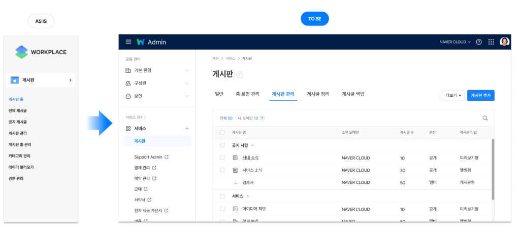 WORKPLACE [게시판 관리 > 게시판 홈 관리 > 게시판 바로가기] 메뉴에서 선택된 게시판은 네이버웍스의 [Admin > 서비스 > 게시판 > 메인]으로 이관 됩니다.