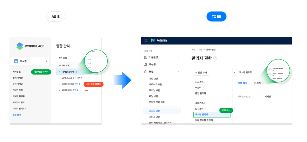 | 이관 제외 데이터 | WORKPLACE의 [게시판 관리 > 권한 설정] 메뉴에서 관리자가 ‘권한 추가’를 통해 생성한 권한 |