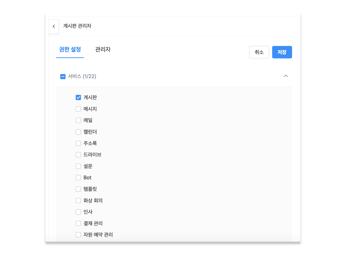 [Admin > 서비스] 메뉴 아래에 있는 각 서비스 단위별로 접근 권한을 부여가 가능합니다. |