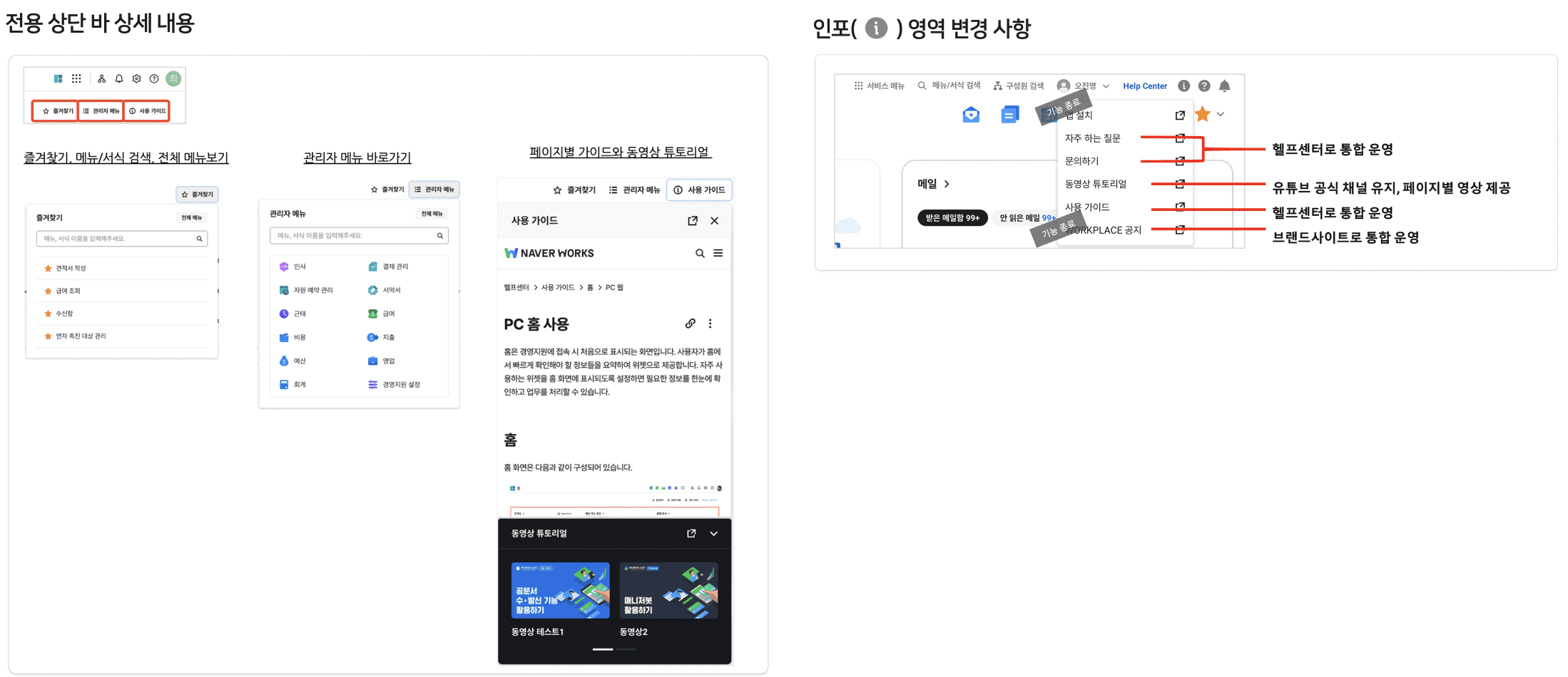 | 우측 상단 물음표 아이콘 | 페이지별 사용 가이드 | WORKPLACE 전용 상단 바 > 사용 가이드로 이관 |