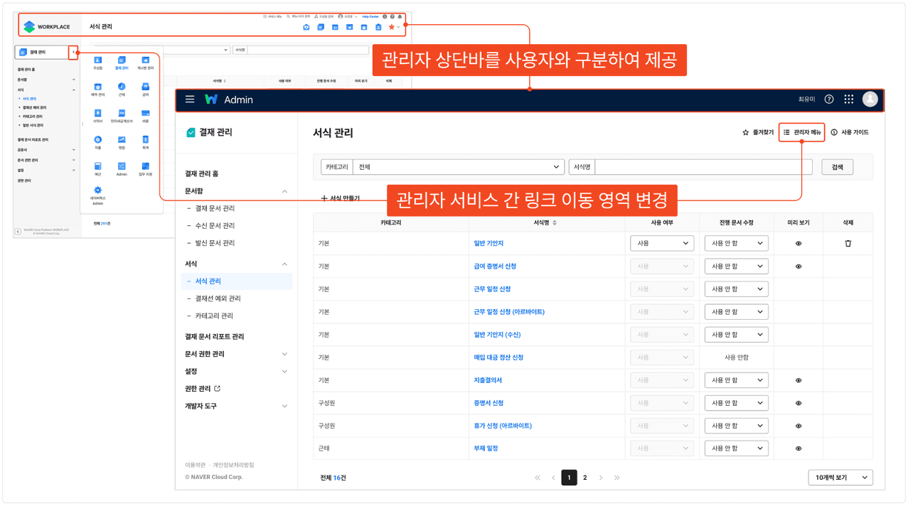 WORKPLACE에서는 사용자와 관리자의 PC웹 상단 바를 동일하게 운영하였으나, 네이버웍스 플랫폼에서는 사용자용과 관리자용을 분리하여 역할에 따른 최상단 메뉴를 구분하여 운영할 예정입니다.