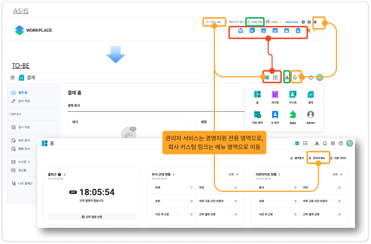 | 관리자 메뉴 | WORKPLACE 전용 상단 바 > 관리자 메뉴로 이관 | |