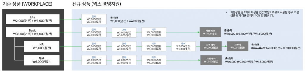 - 기업 상황에 맞추어 필요한 시점에 필요한 상품만 합리적으로 구매할 수 있도록 상품 구성이 변경되었으며, 현재 이용 고객사의 경우 상품 구성이 달라지더라도 기존 가격 혜택은 그대로 제공됩니다.